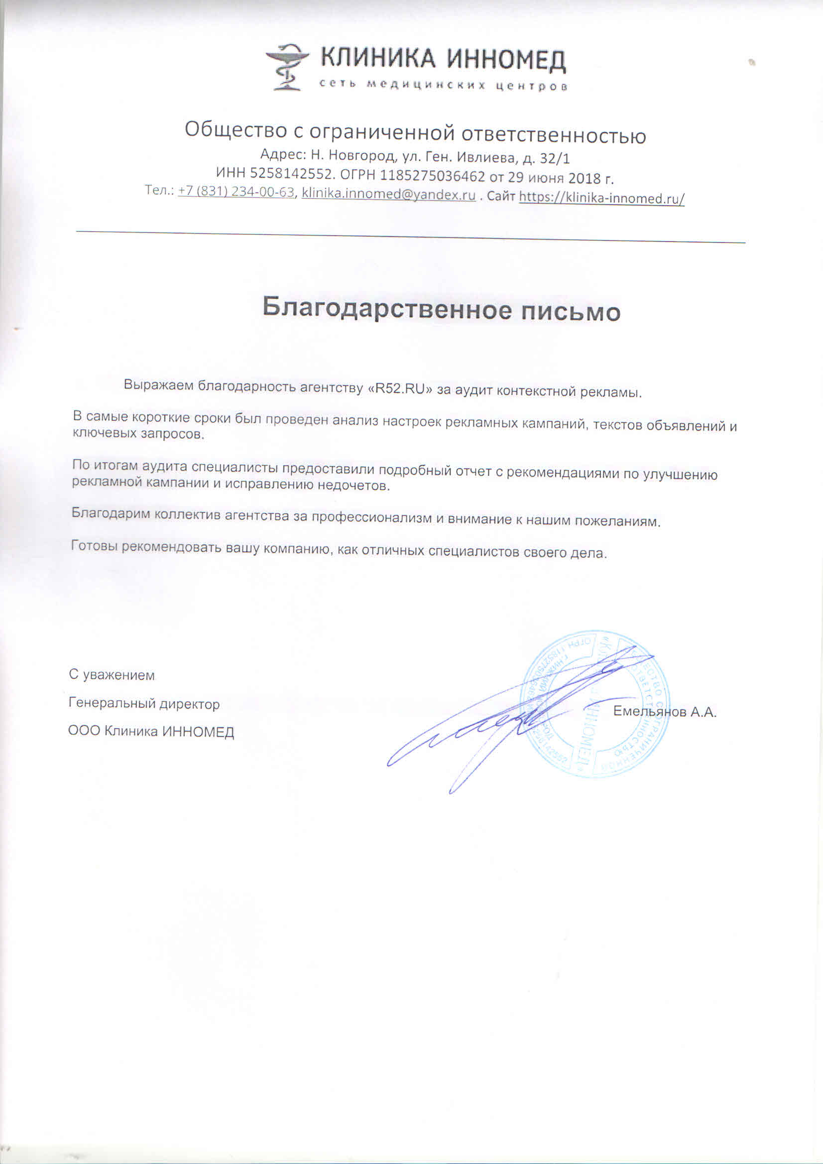 Выражаем благодарность агентству «R52.RU» за аудит контекстной рекламы. В самые короткие сроки был проведен анализ настроек рекламной компании, текстов объявлений и ключевых запросов. По итогам аудита специалисты предоставили подробный отчет с рекомендациями по улучшению рекламной кампании и исправлению недочетов.