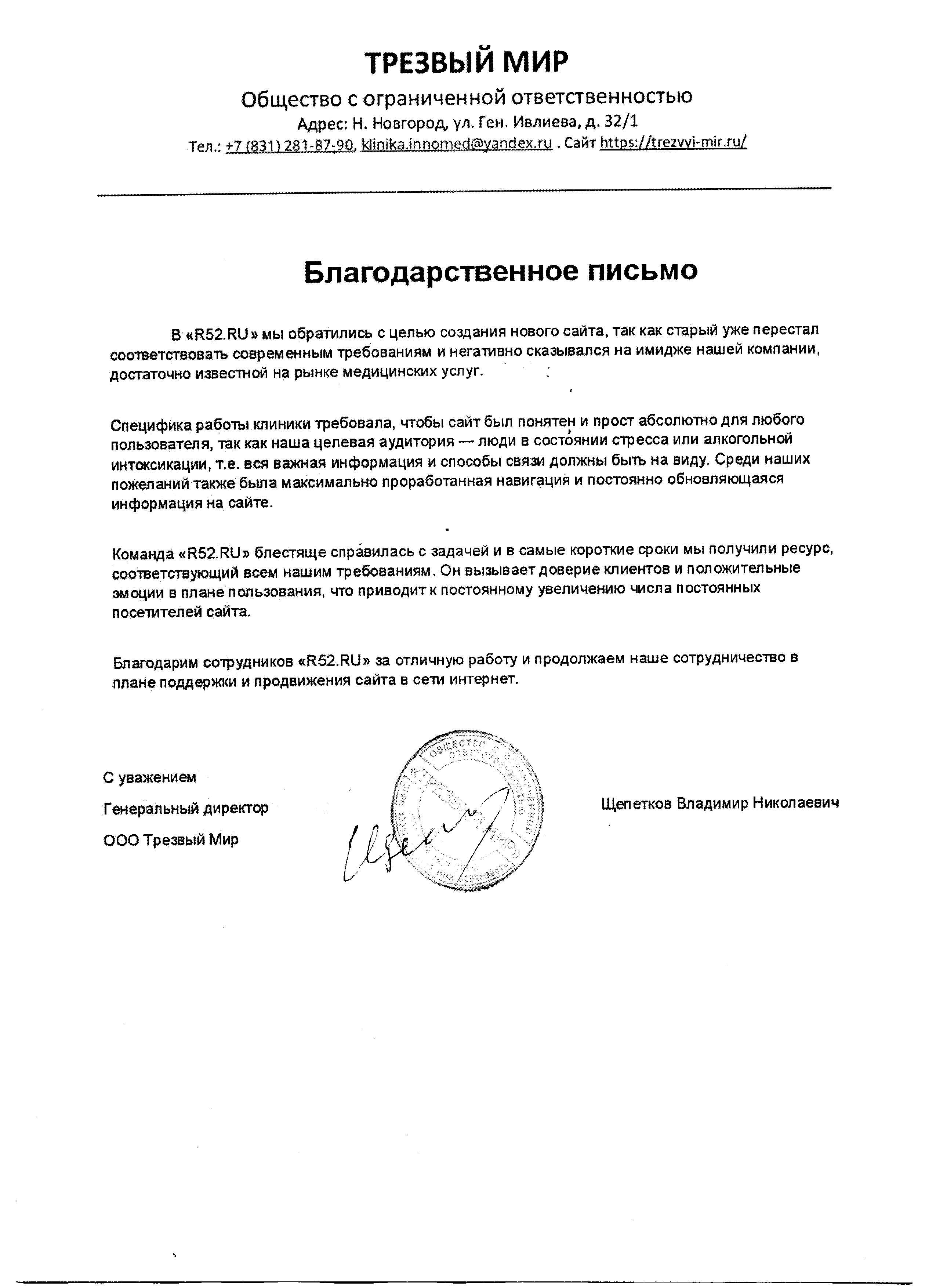 Благодарим сотрудников «R52.RU» за отличную работу и продолжаем наше сотрудничество в плане поддержки и продвижения сайта в сети интернет.