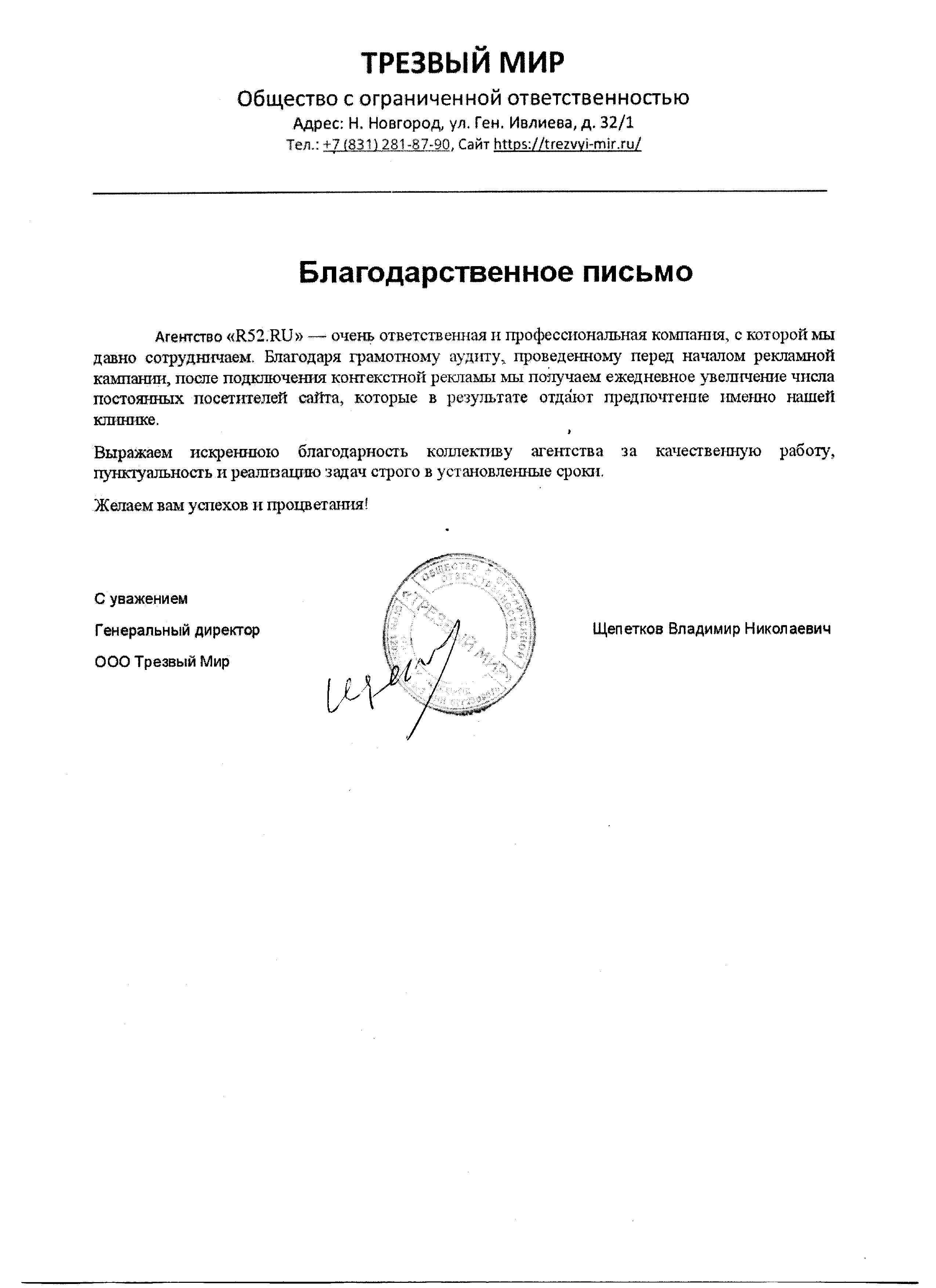 Агентство «R52.RU» — очень ответственная и профессиональная компания, с которой мы давно сотрудничаем. Благодаря грамотному аудиту, проведенному перед началом рекламной кампании, после подключения контекстной рекламы мы получаем ежедневное увеличение числа постоянных посетителей сайта, которые в результате отдают предпочтение именно нашей клинике.