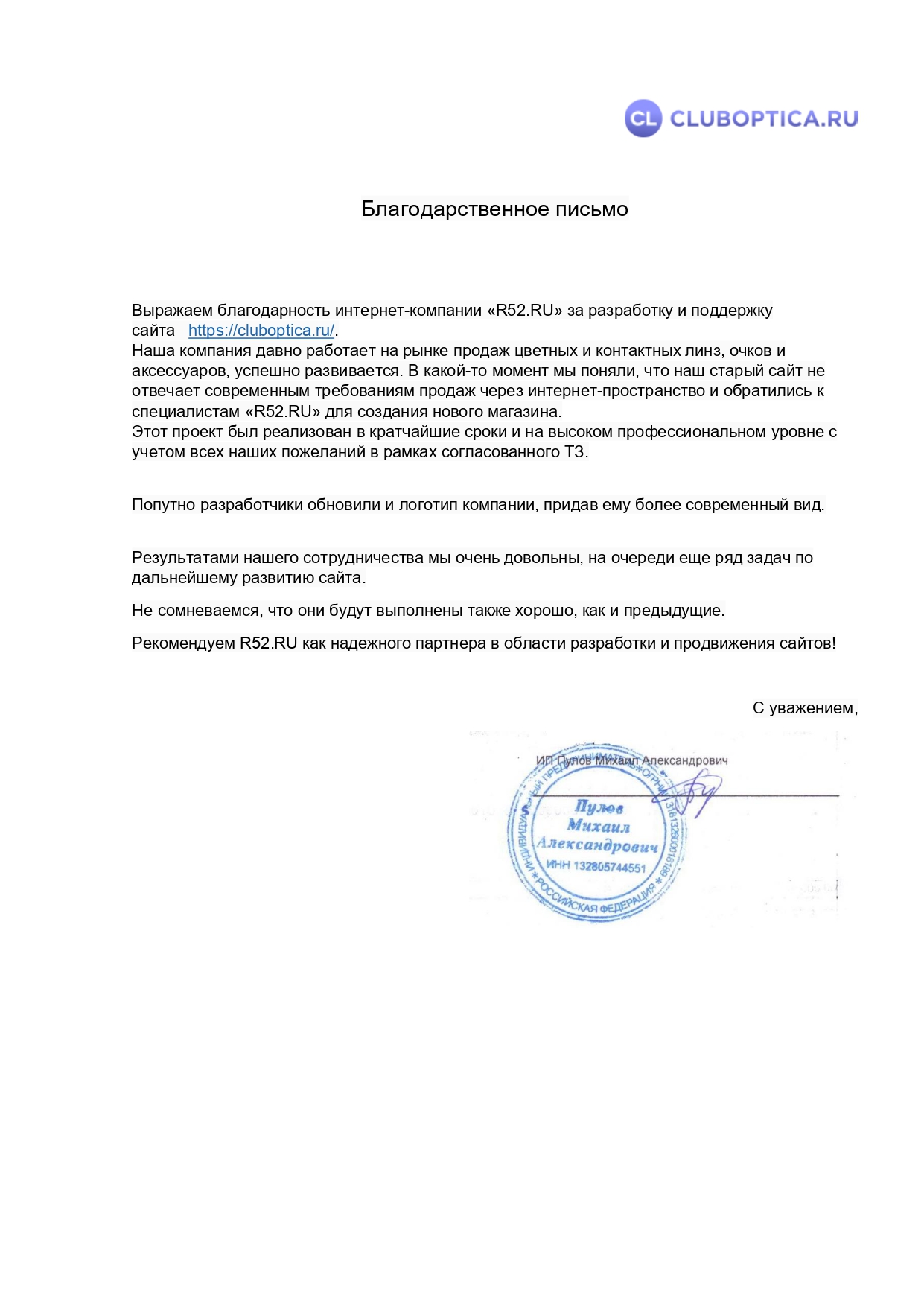 Выражаем благодарность компании «R52.RU» за разработку и поддержку сайта cluboptica.ru